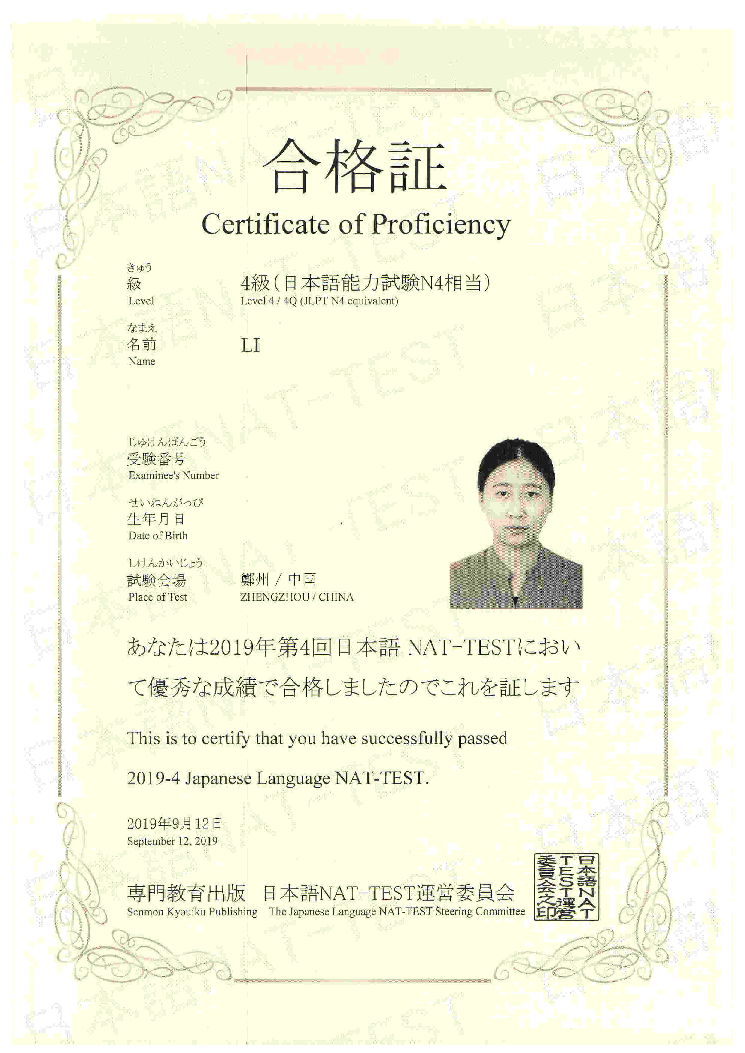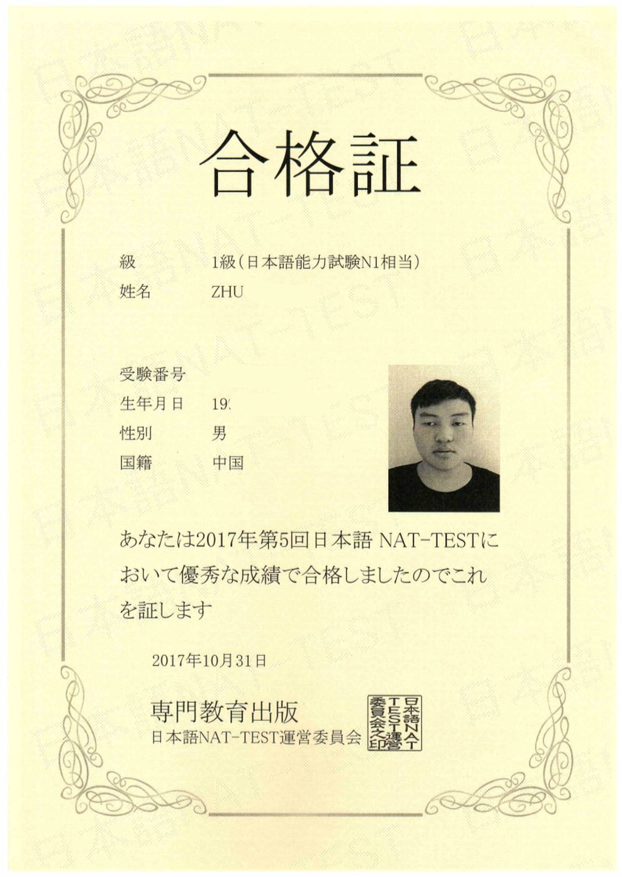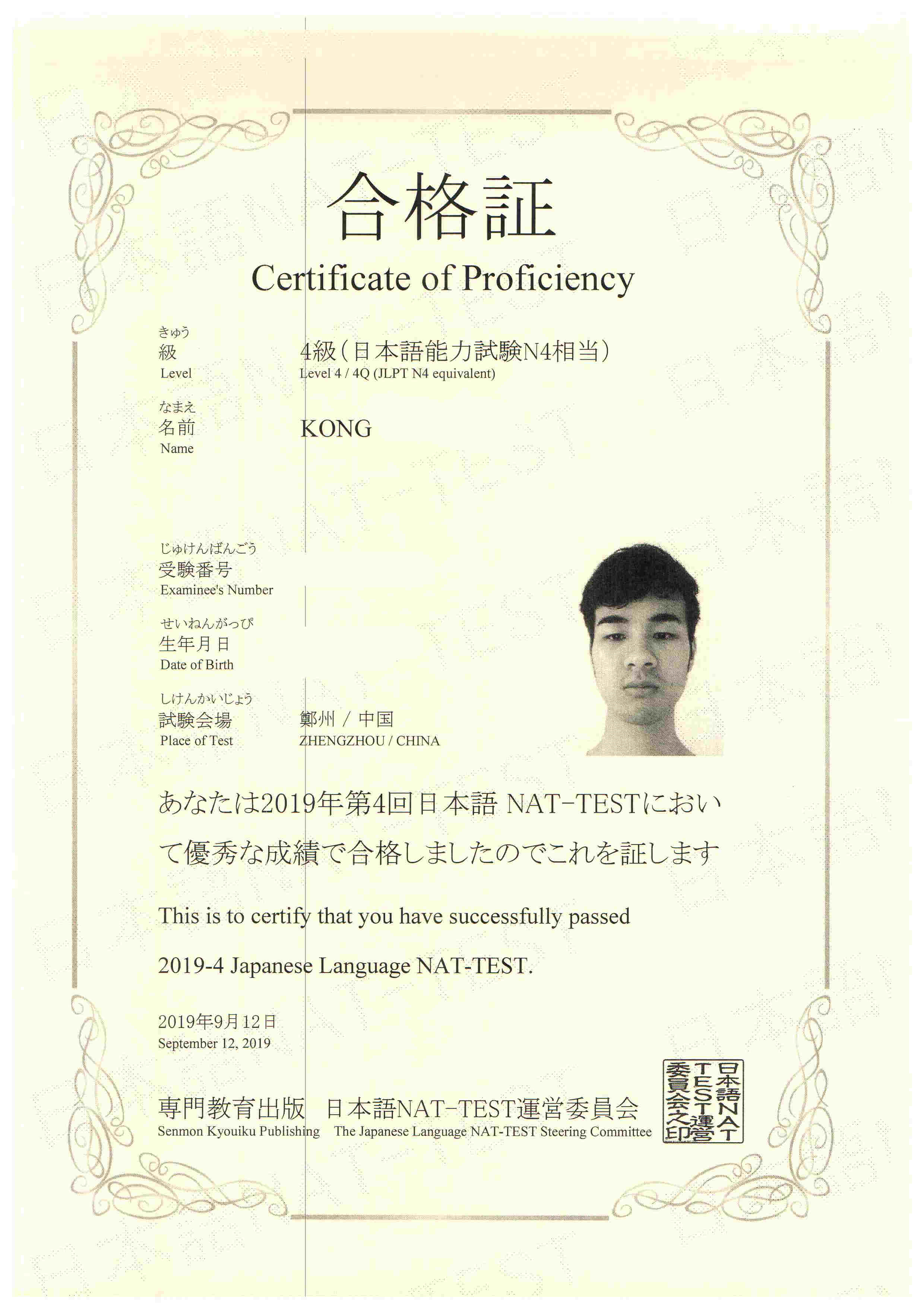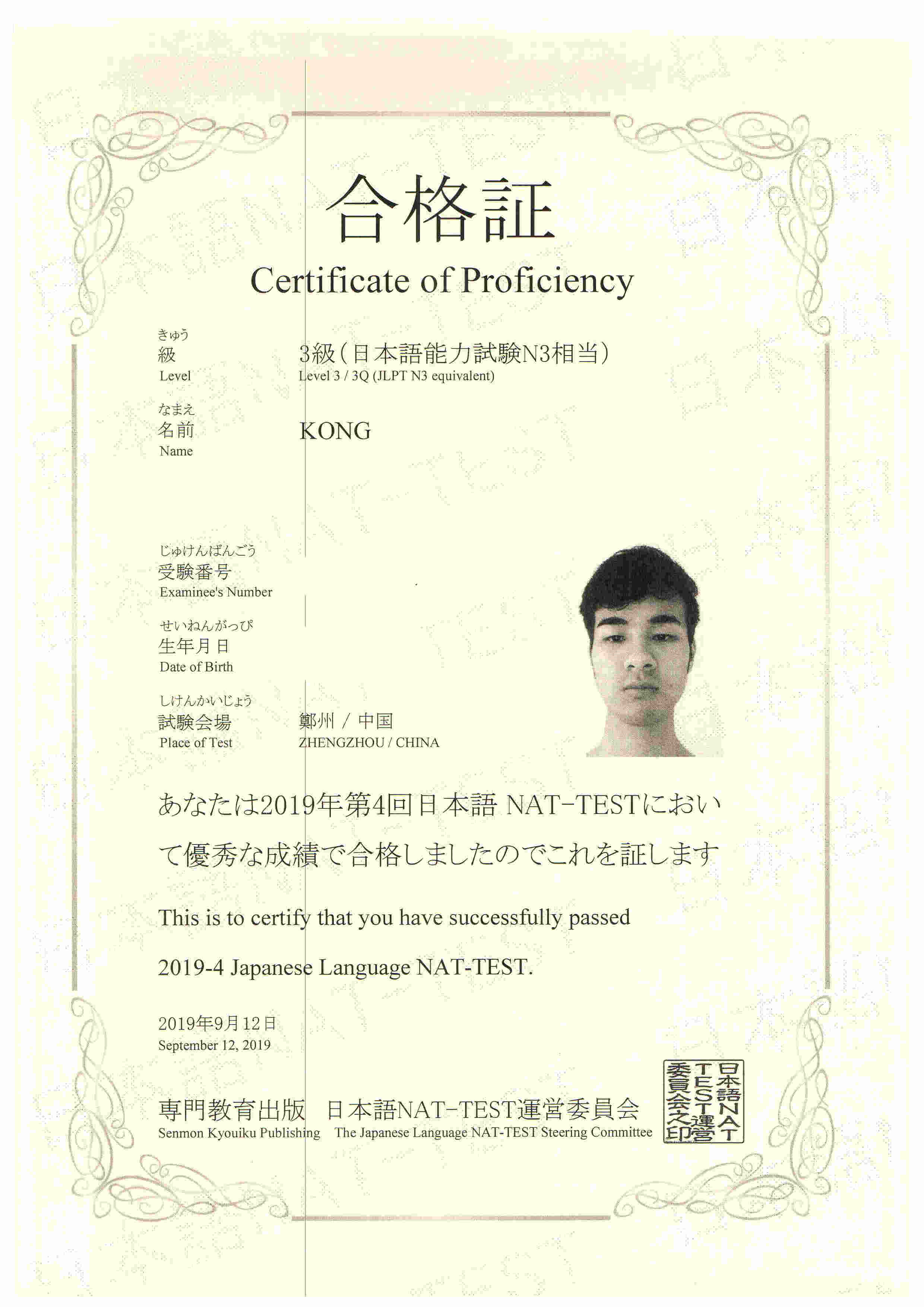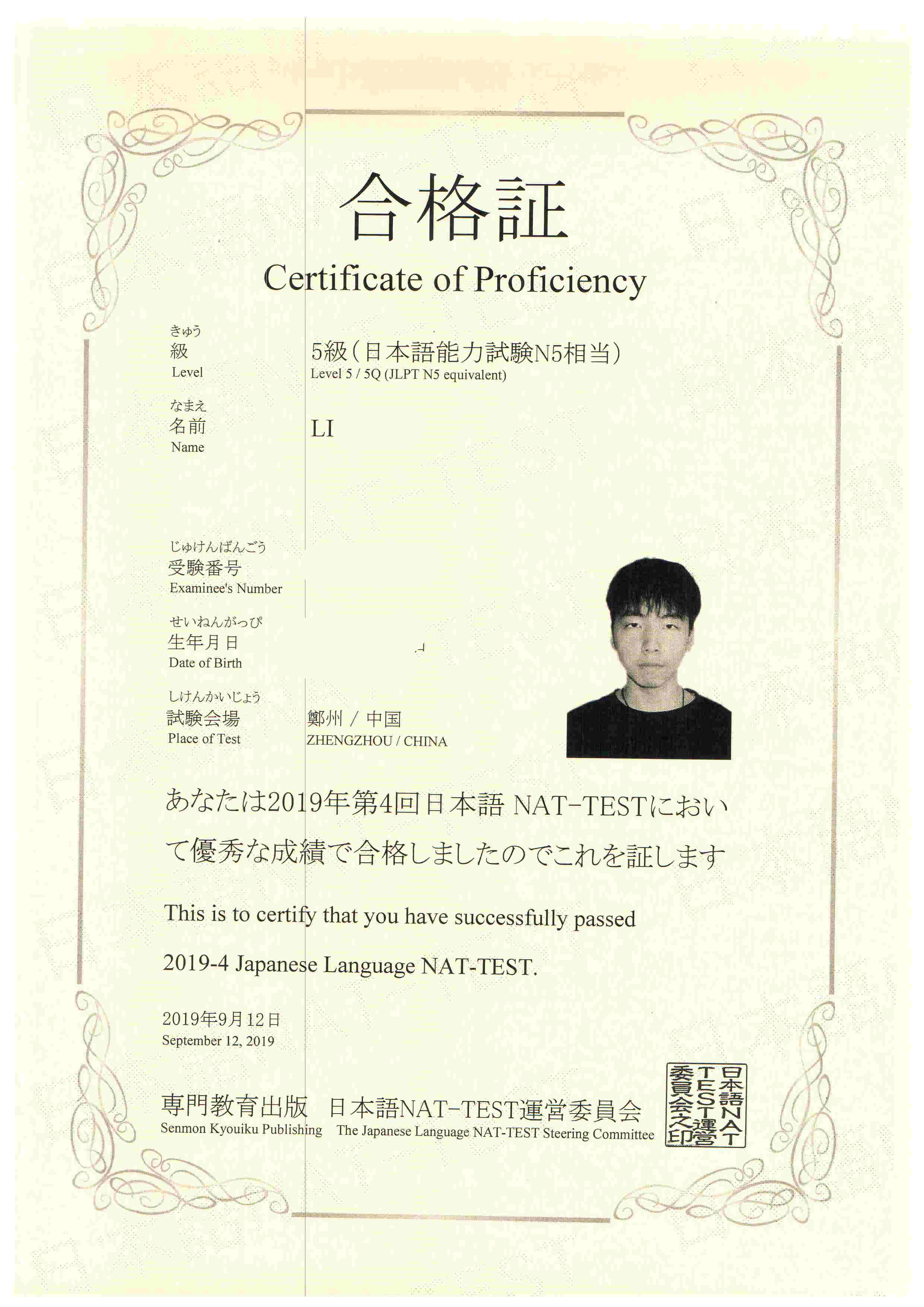 Bin Jie Examination certificate