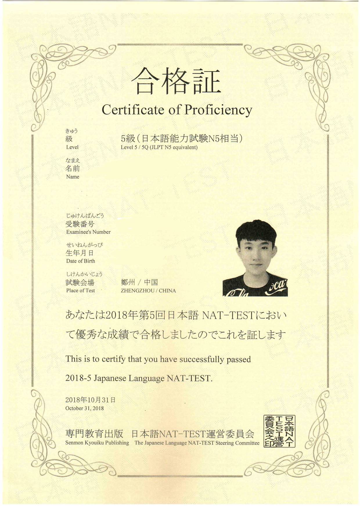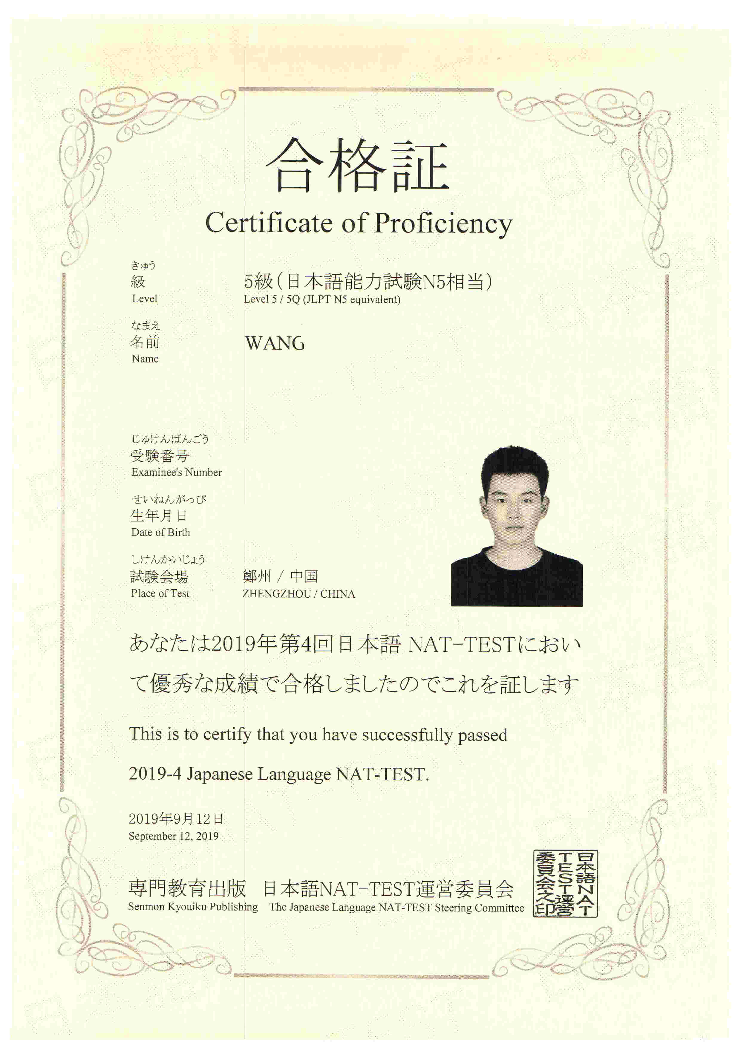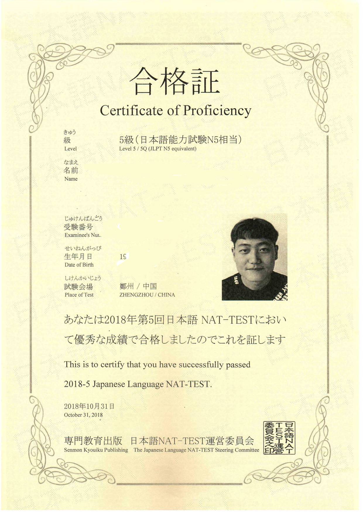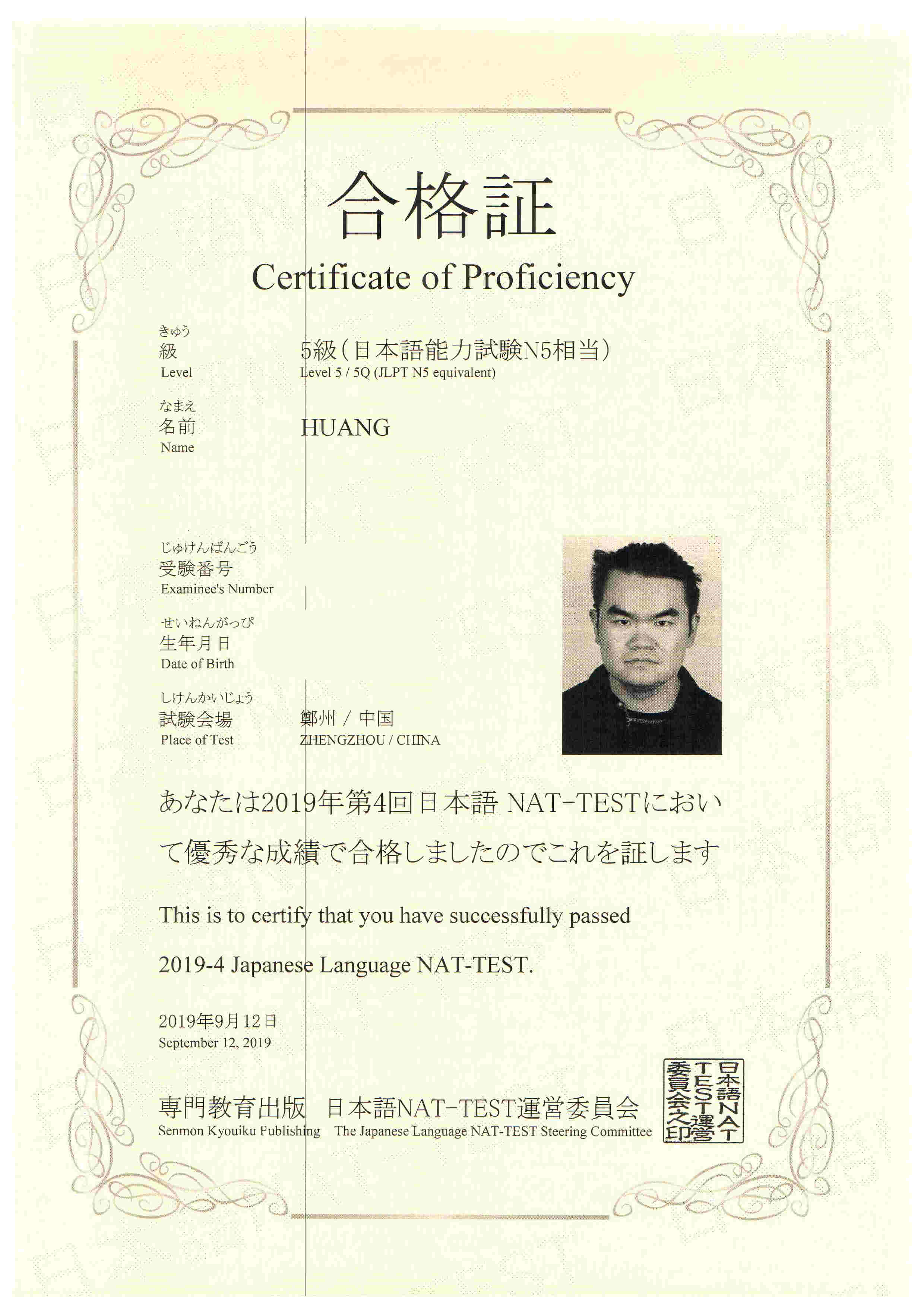 Bin Jie Examination certificate