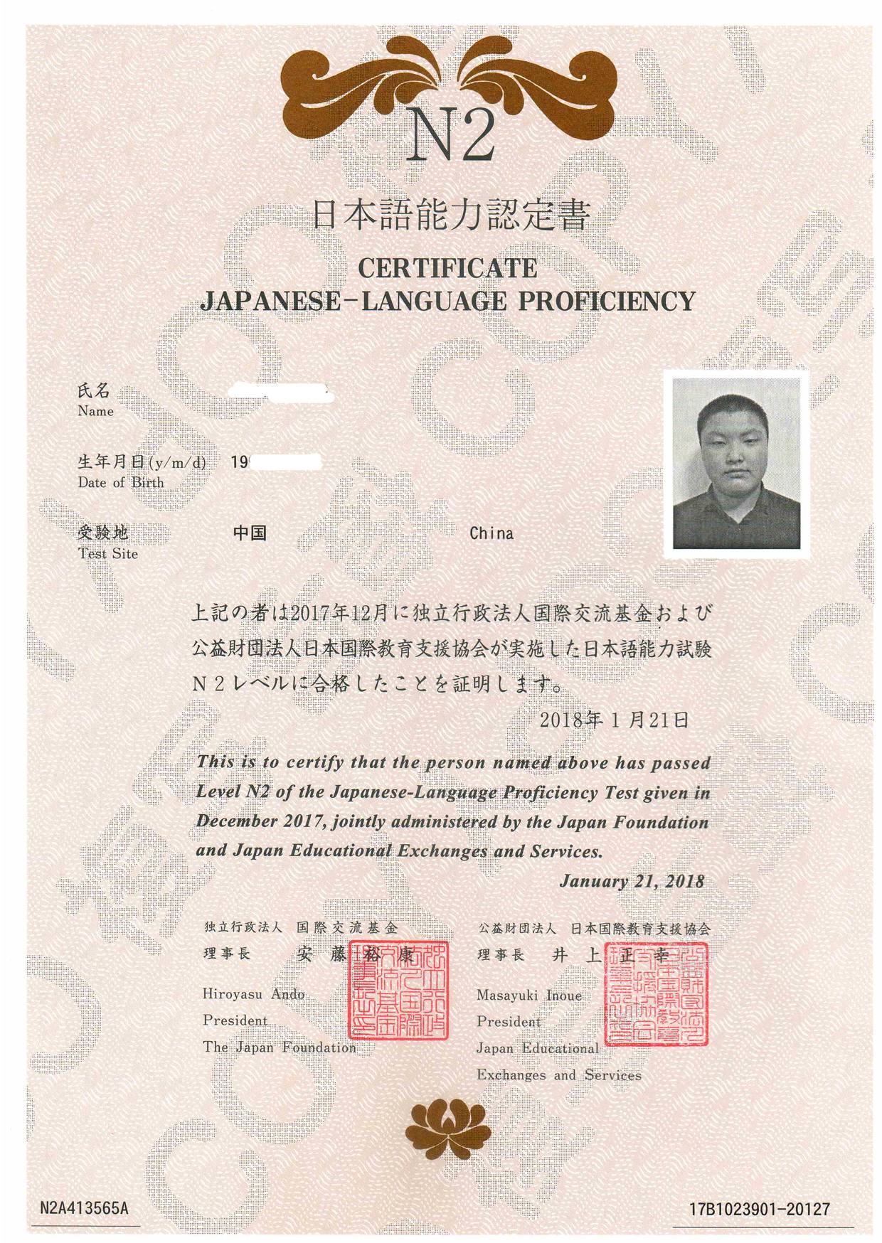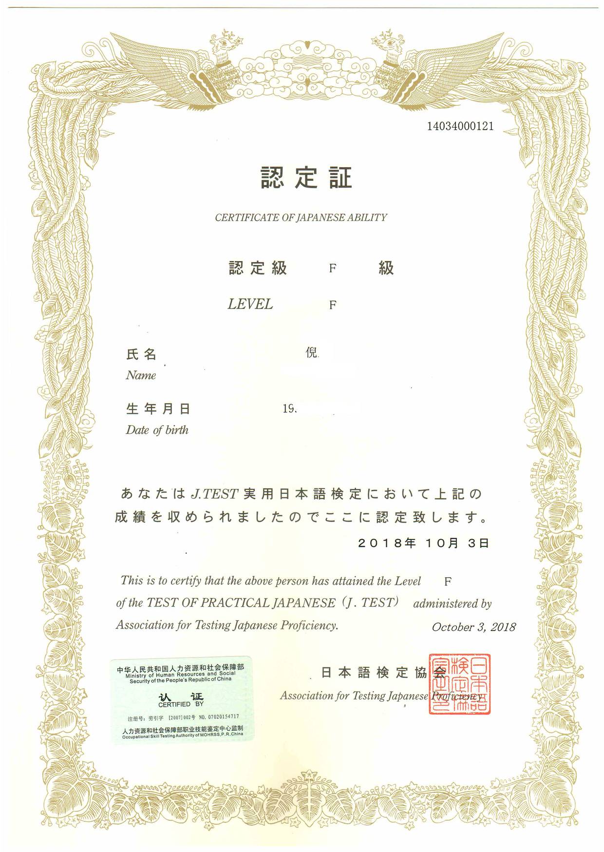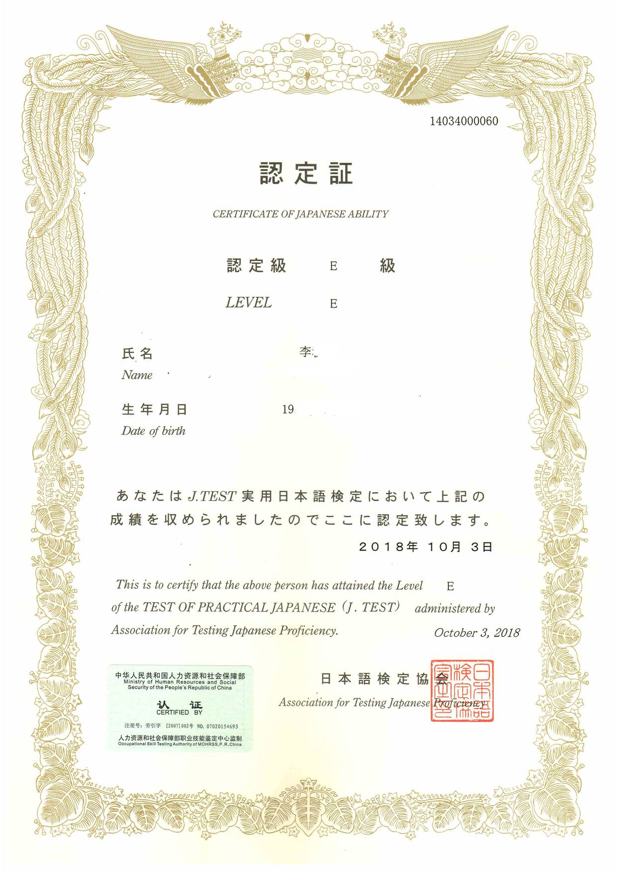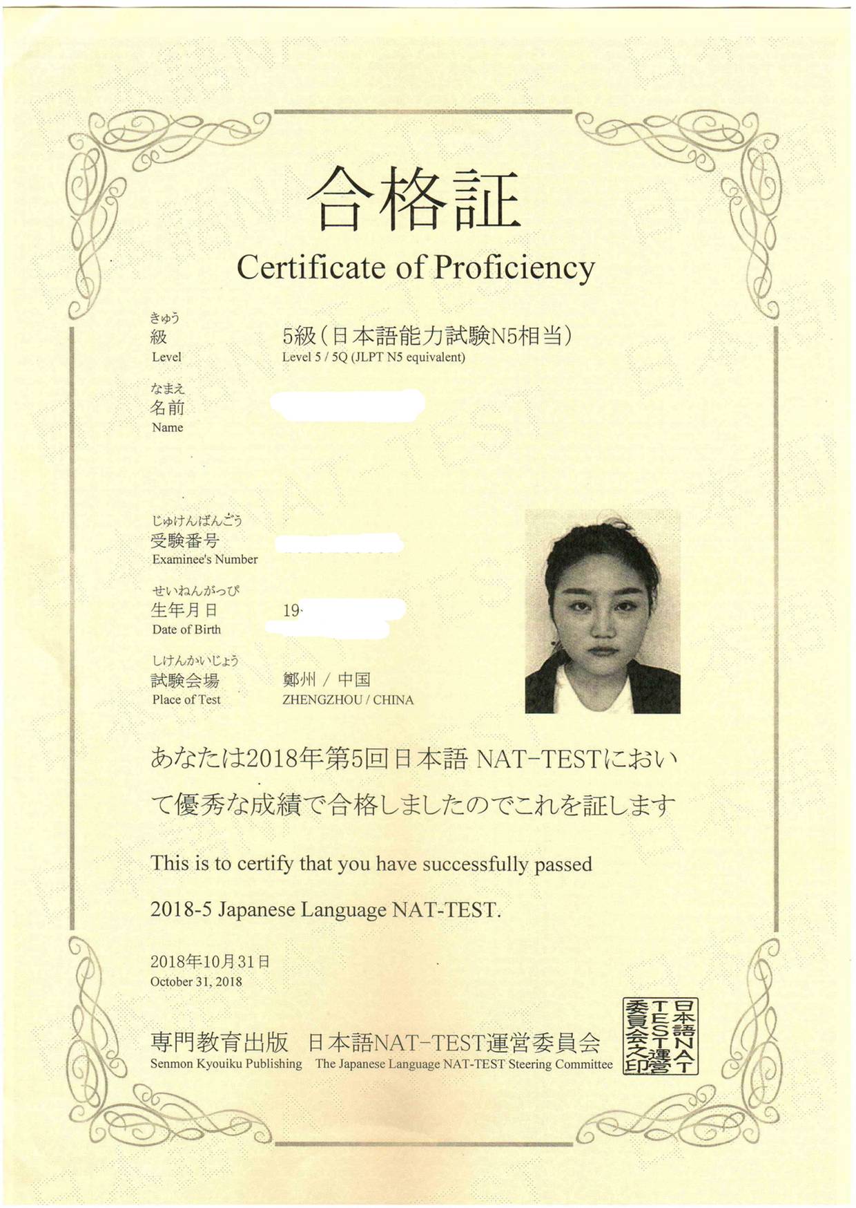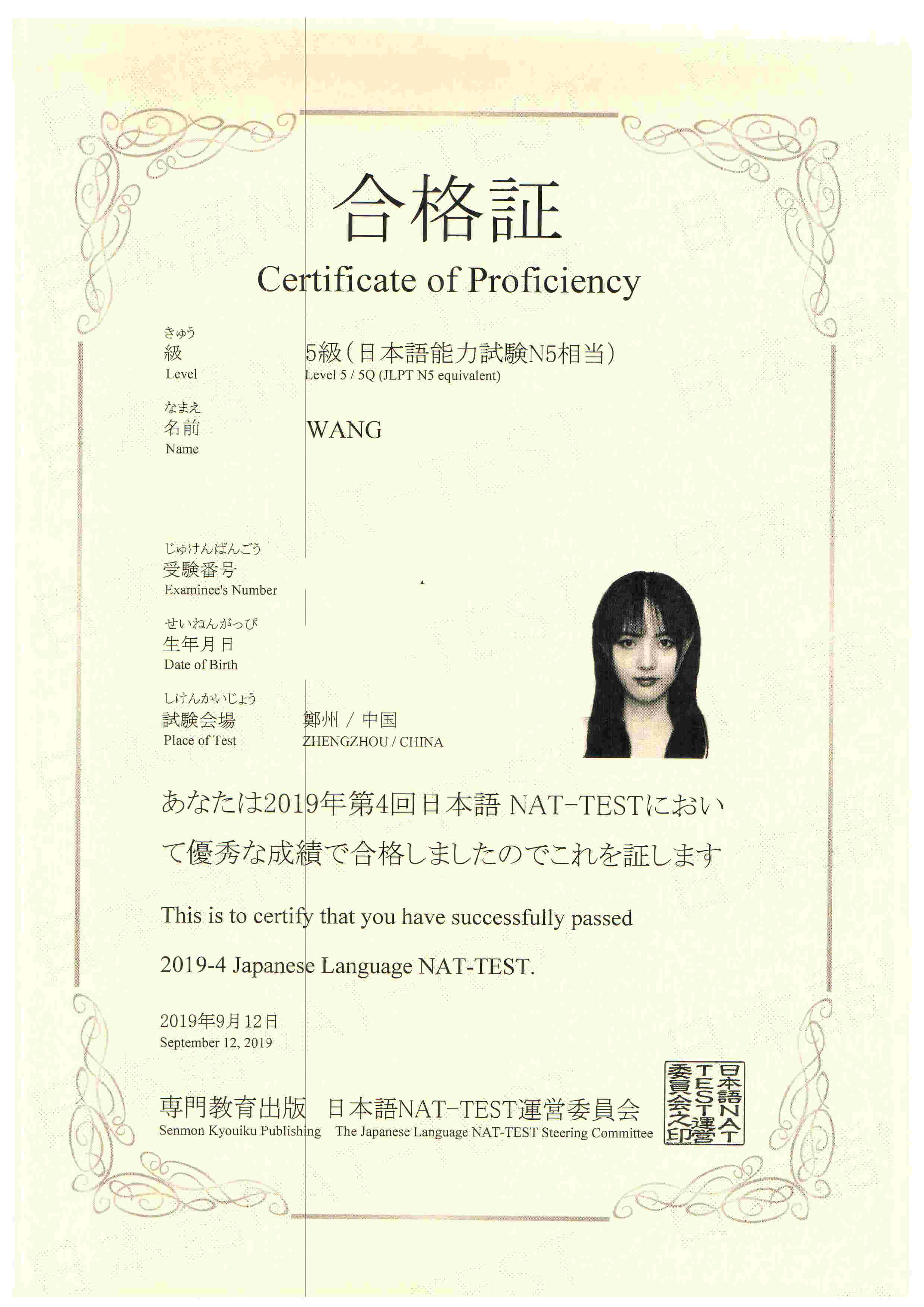 Bin Jie Examination certificate