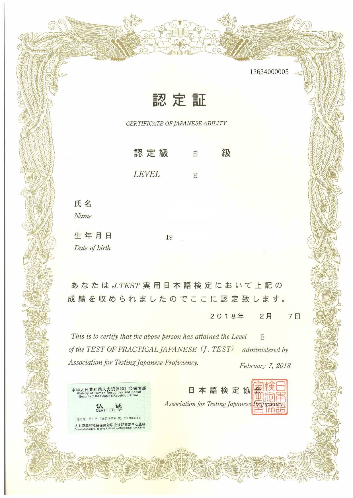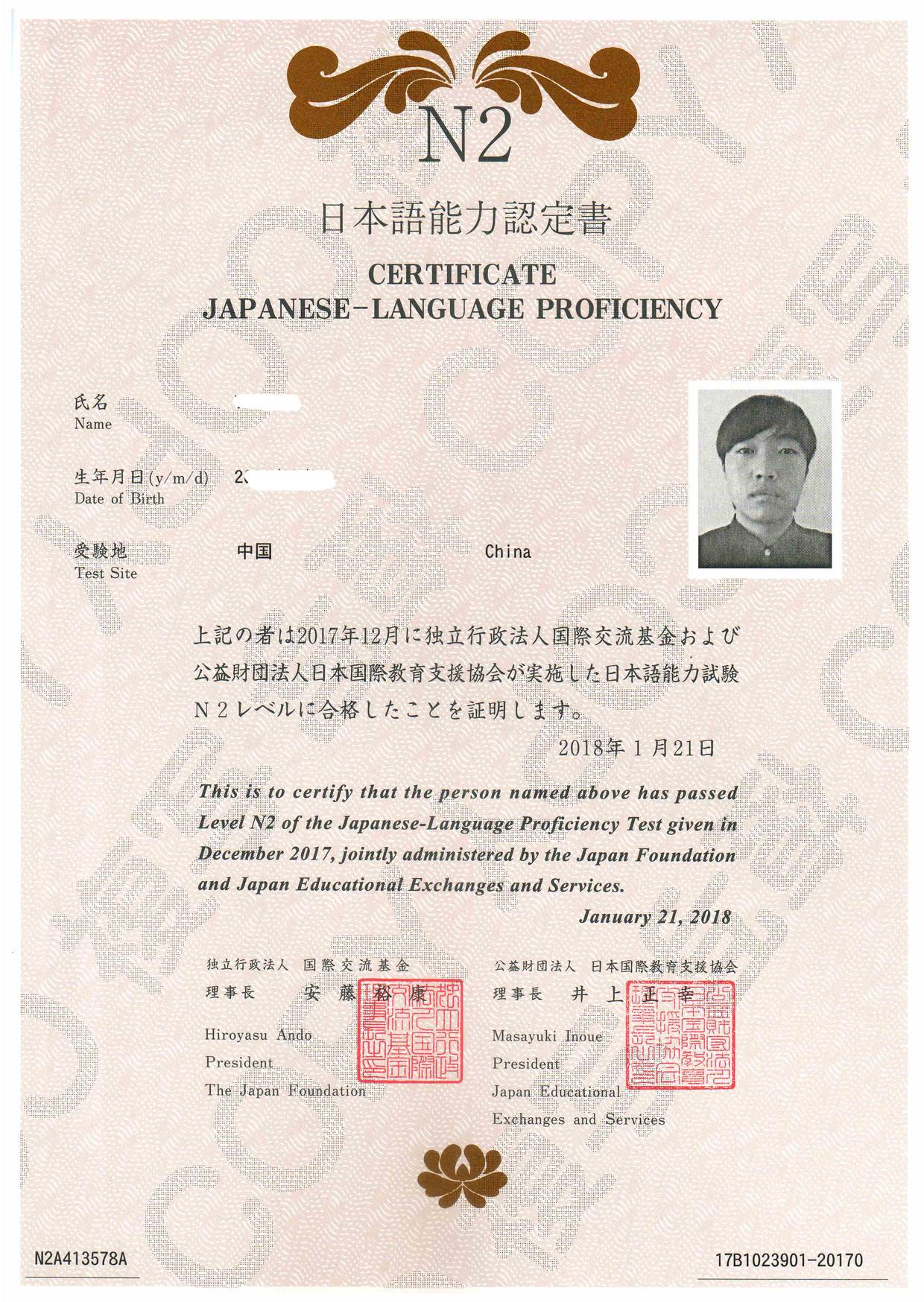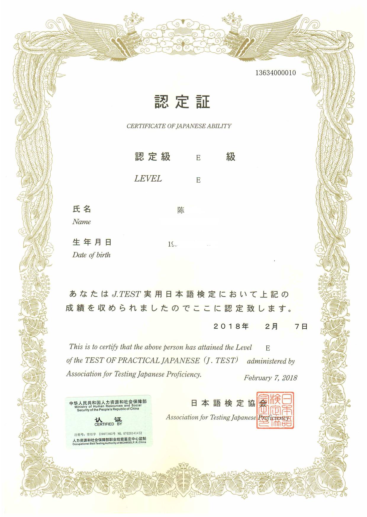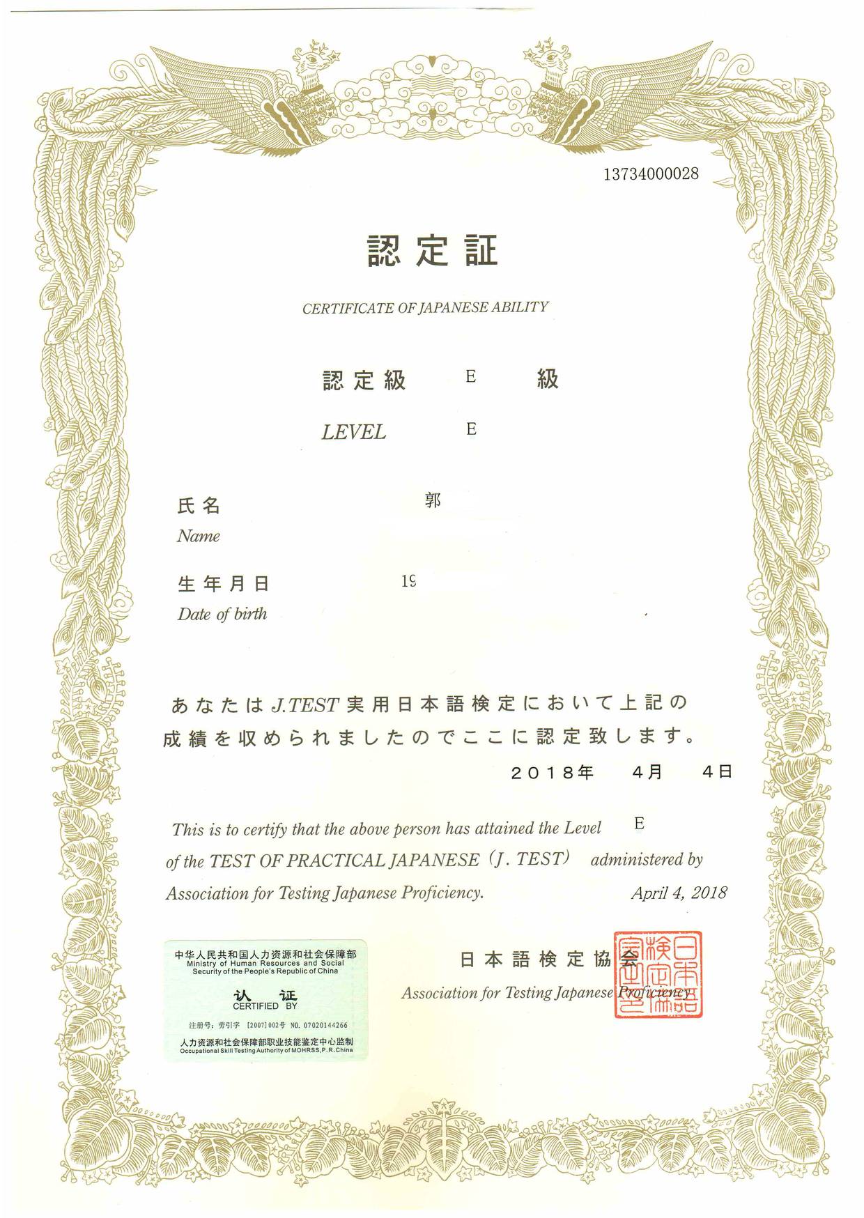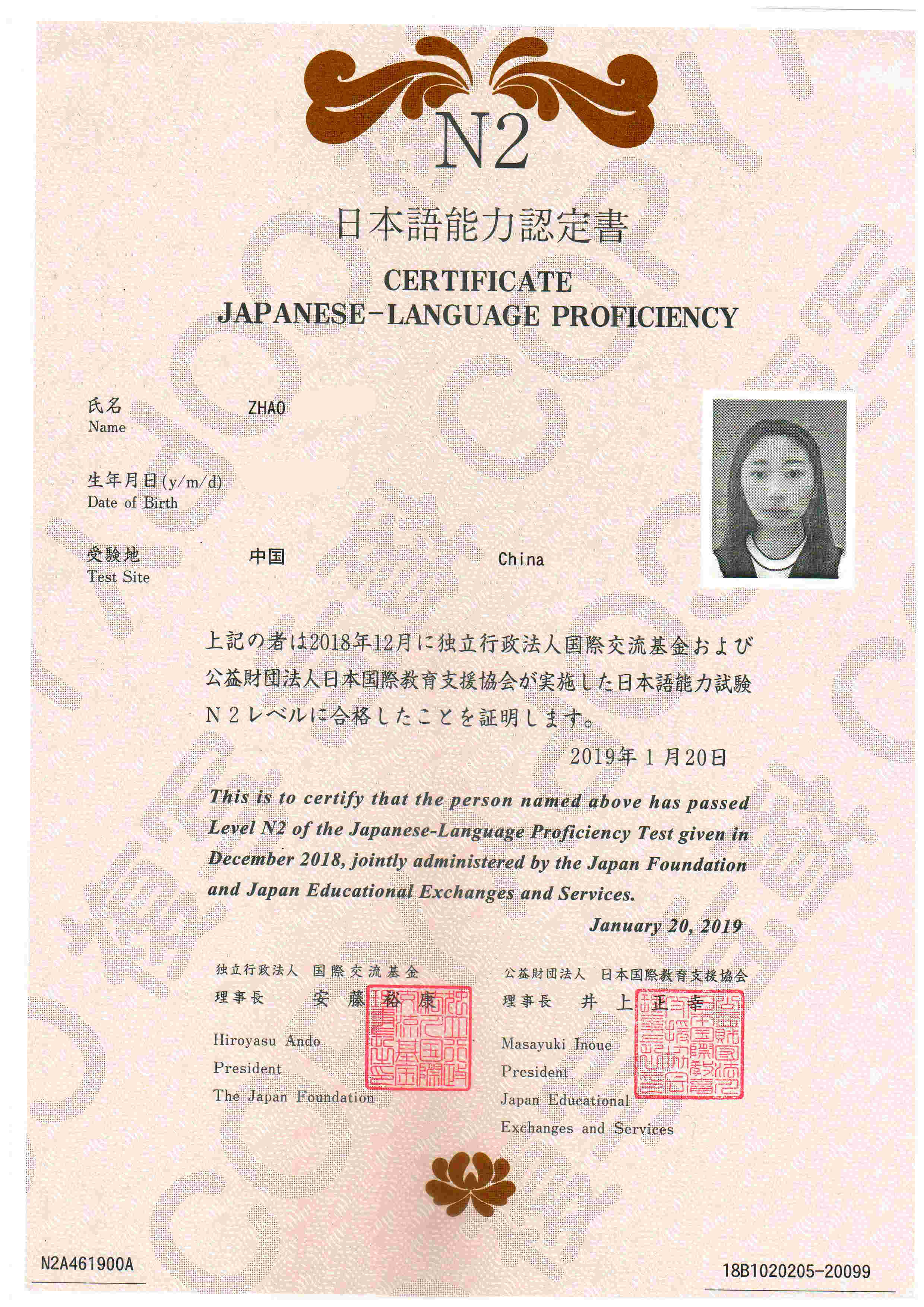Bin Jie Examination certificate